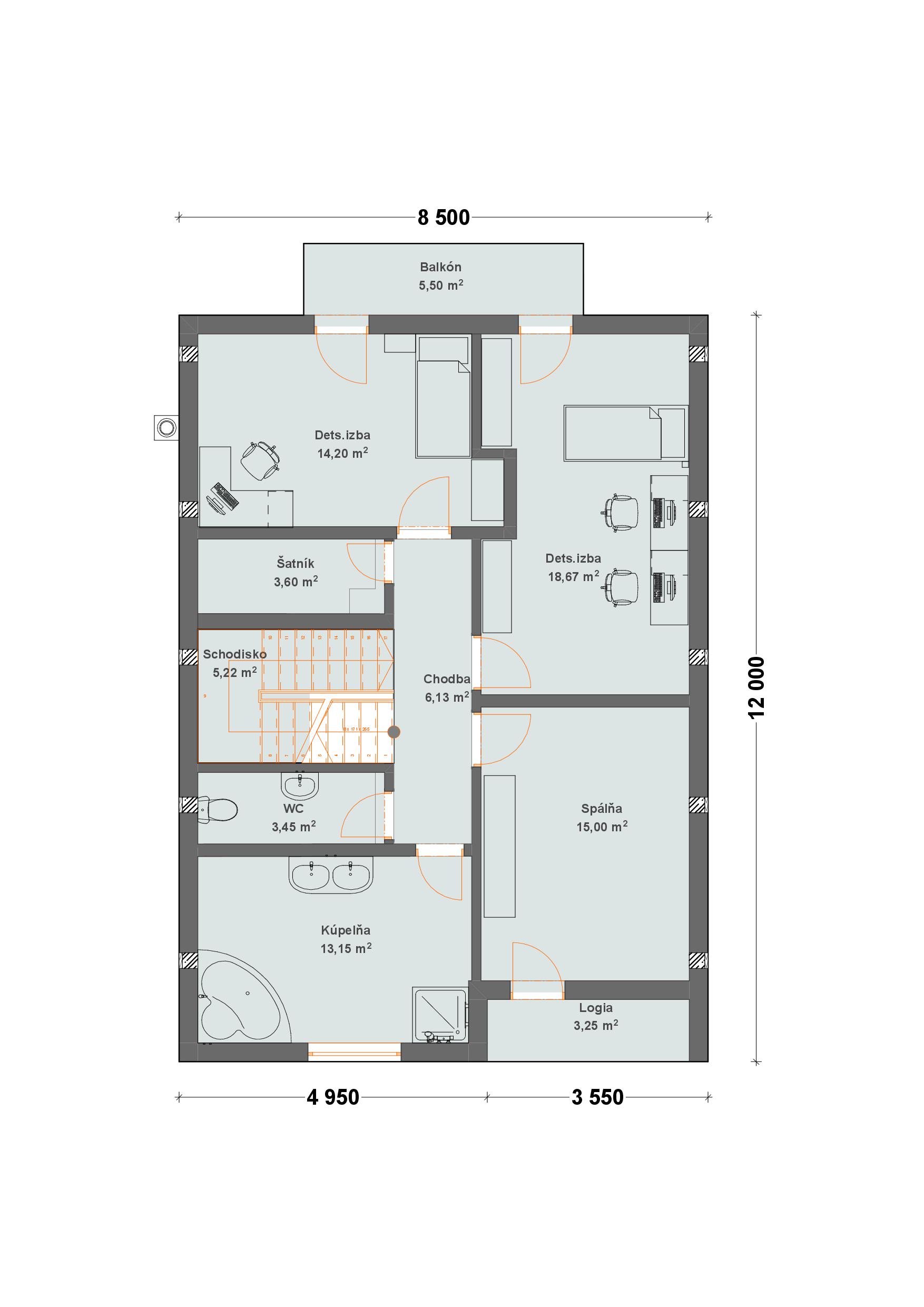 Poschodie je riešené ako nočná časť domu a tvoria ho tri izby s výstupom na balkón, kúpeľňa, WC, šatník a schodisko.