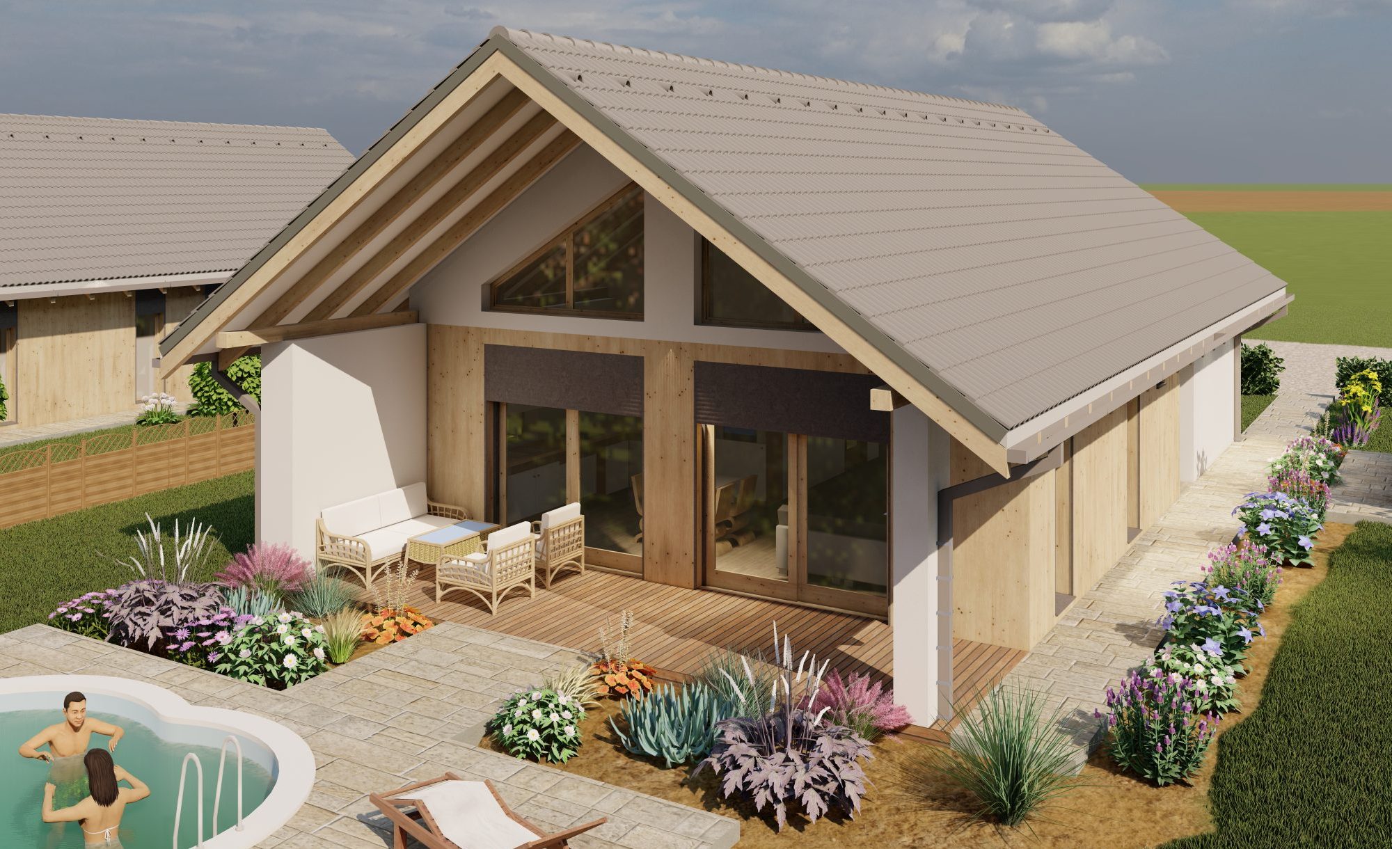Obývačka, jedáleň a kuchyňa tvoria otvorený, vzdušný priestor, ktorý sa plynulo prepája s exteriérom prostredníctvom veľkého východu na terasu. Dom obsahuje dve pohodlné spálne, ktoré poskytujú ideálne miesto na odpočinok, kúpeľňu, WC, špajzu a technickú miestnosť, ktorá zabezpečuje dostatok úložného priestoru. Praktické zádverie je vstupom do domu a zároveň slúži ako predel medzi vonkajším a vnútorným priestorom. Dodatkový povalový priestor ponúka ďalšie možnosti pre uskladnenie alebo budúce prispôsobenie podľa potrieb rodiny.
